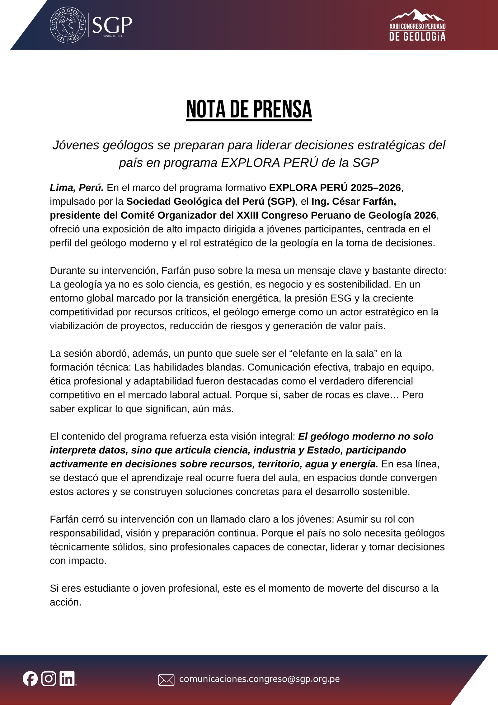 "GEOLOGÍA PARA EL DESARROLLO DEL PAÍS Y LA REGIÓN"