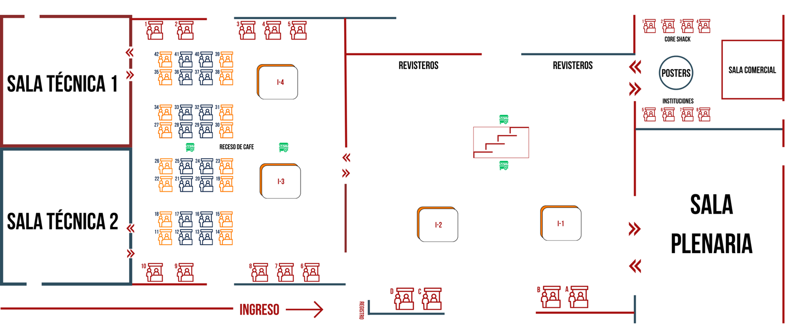El plano de la exhibición ha sido diseñado para maximizar la visibilidad y circulación de visitantes, considerando accesos principales, zona de coffee breaks y proximidad a las salas de conferencias.